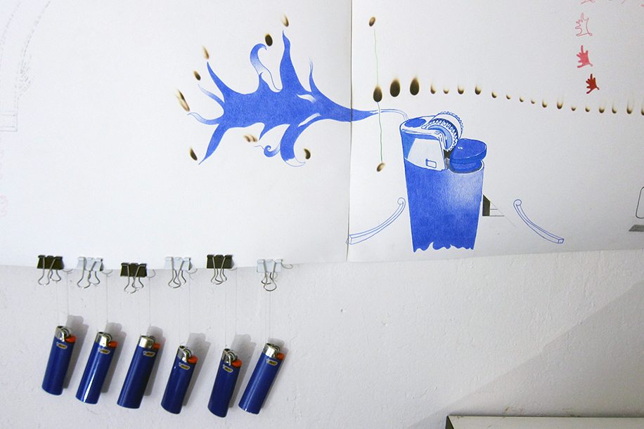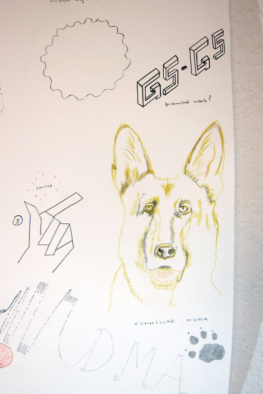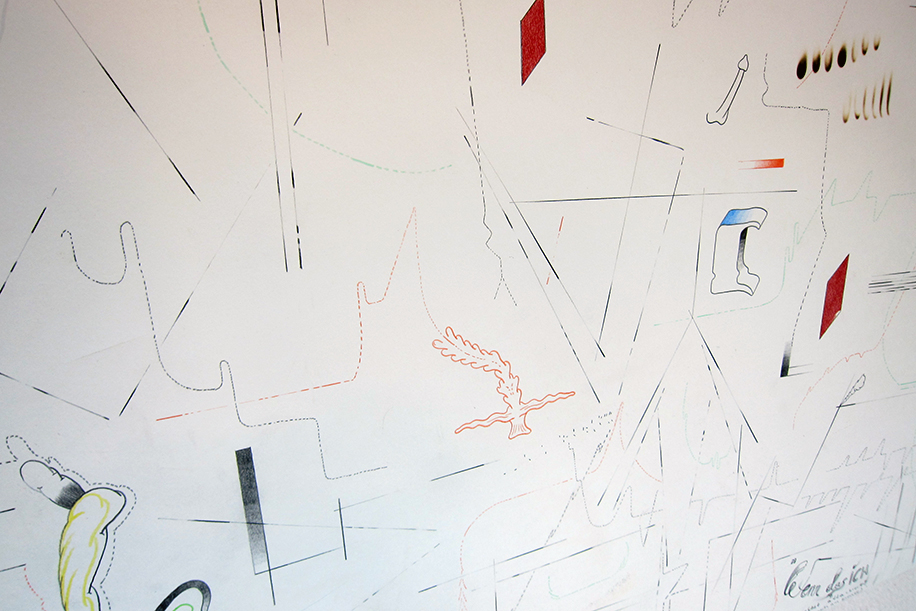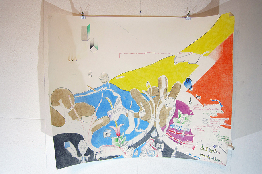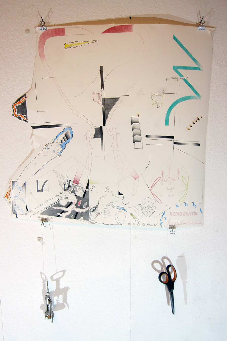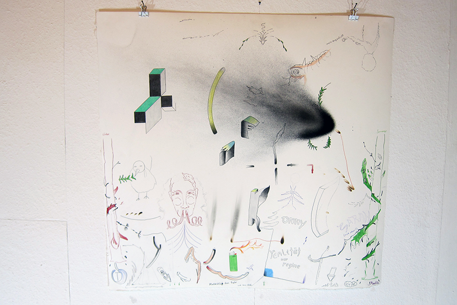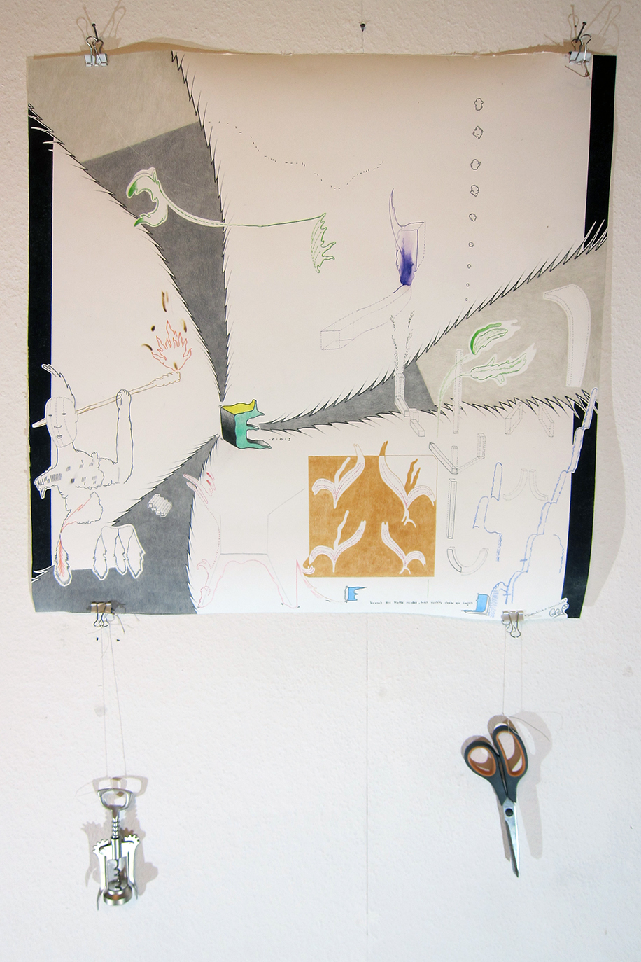 Begehbare Zeichnung: Zeichnungen Buntstift auf Papier, Objekte aus Holz